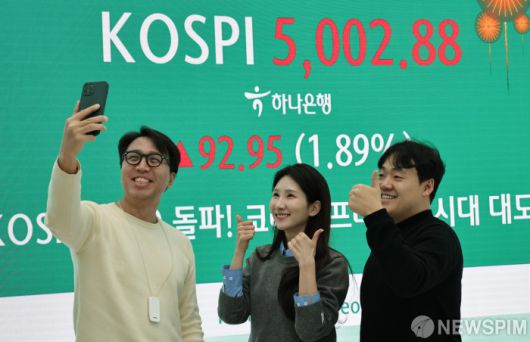 [서울=뉴스핌] 양윤모 기자 = 22일 코스피가 5000을 돌파하자 서울 중구 하나은행본점 딜링룸에서 직원들이 휴대폰을 이용해 기념촬영을 하고 있다. 한편 이재명 대통령은 더불어민주당 '코스피 5,000 특별위원회' 소속 위원들을 청와대로 초청해 오찬을 함께했다. 2026.01.22 yym58@newspim.com |