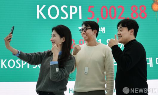 [서울=뉴스핌] 양윤모 기자 = 22일 코스피가 5000을 돌파하자 서울 중구 하나은행본점 딜링룸에서 직원들이 휴대폰을 이용해 기념촬영을 하고 있다. 한편 이재명 대통령은 더불어민주당 '코스피 5,000 특별위원회' 소속 위원들을 청와대로 초청해 오찬을 함께했다. 2026.01.22 yym58@newspim.com |