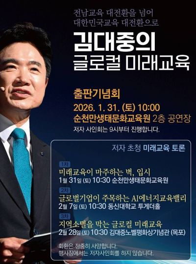 김 교육감은 오는 31일 오전 10시 순천만생태문화교육원 2층 공연장에서 출판기념회를 개최한다고 밝혔다. 이번 행사는 단순한 저서 소개를 넘어 급변하는 교육 환경 속에서 전남 교육이 나아가야 할 '글로컬(Glocal)' 전략을 공유하는 자리가 될 전망이다.