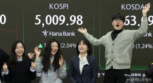 (서울=뉴스1) 박지혜 기자 = 22일 오전 서울 중구 하나은행 본점 딜링룸 현황판에 코스피 지수가 장중 5000p를 넘으며 개장하자 직원들이 환호하고 있다. 2026.1.22/뉴스1 Copyright (C) 뉴스1. All rights reserved. 무단 전재 및 재배포, AI학습 이용 금지. /사진=(서울=뉴스1) 박지혜 기자 |