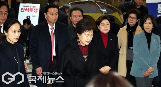 (서울=국제뉴스) 박근혜 전 대통령이 22일 서울 여의도 국회 로텐더홀 에서 통일교·공천헌금 '쌍특검' 수용을 촉구하며 단식농성중인 장동혁 국민의힘 대표를 찾아 대화를 마치고 단식 농성장을 나서고 있다./사진=이용우 기자