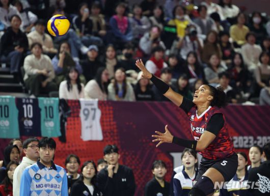 [인천=뉴시스] 김금보 기자 = 27일 오후 인천 부평구 인천삼산월드체육관에서 열린 프로배구 도드람 2023~2024 V-리그 올스타전, 스파이크 서브퀸 콘테스트에서 실바가 스파이크 서브를 하고 있다. 2024.01.27. kgb@newsis.com |