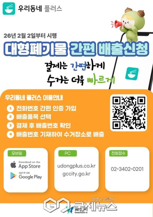 (과천=국제뉴스) 이운길·손병욱 기자 = 과천시는 시민 편의를 높이기 위해 오는 2월 2일부터 대형폐기물 온라인·모바일 배출 시스템을 본격 운영한다고 밝혔다.