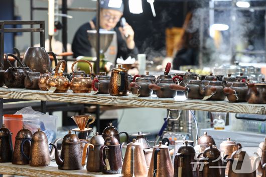 (고양=뉴스1) 김도우 기자 = 22일 경기 고양시 킨텍스에서 열린 2026 카페디저트페어에서 관람객들이 커피용품을 살펴보고 있다. 2026.1.22/뉴스1pizza@news1.krCopyright ⓒ 뉴스1. All rights reserved. 무단 전재 및 재배포, AI학습 이용 금지.