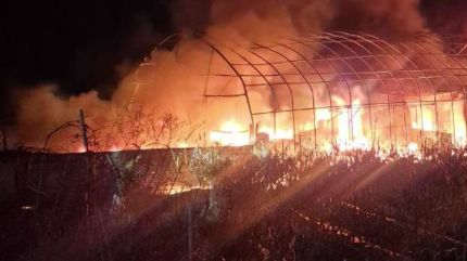 비닐하우스에서 시뻘건 불길이 치솟고 소방관들이 뼈대만 앙상하게 남은 비닐하우스를 살피고 있습니다.