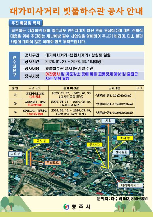 아울러 통행 제한 내용과 우회 노선을 시 누리집·충주톡·SNS 등으로 안내하고 출퇴근 시간대 교통요원 배치, 임시 안내표지판·노면유도선 설치 등을 통해 혼잡을 최소화하기로 했다.
