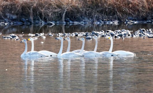 영하권 추위가 이어진 충북 괴산군 달천강변에 겨울 철새 큰고니 가족이 모습을 드러냈다. |