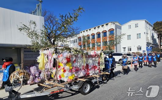 남해군 해녀협회가 22일 남해군청 앞에서 생존권 보상 집회를 열면서 상여를 끌고가는 퍼포먼스를 벌이고 있다. 2026.1.22/뉴스1 한송학기자 |