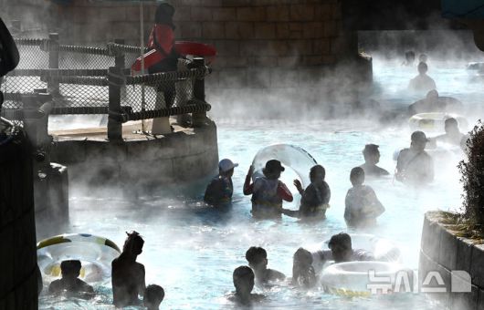 [용인=뉴시스] 김종택 기자 = 전국적으로 매서운 한파가 이어지고 있는 22일 경기 용인시 캐리비안 베이를 찾은 시민들이 수증기가 피어 오르는 야외 유수풀에서 즐거운 시간을 보내고 있다. 2026.01.22. jtk@newsis.com |