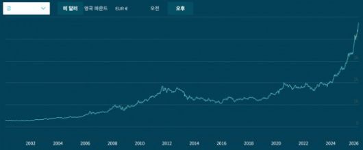 국제 금 시세(위)와 은 시세 2020.1~2026.1. 출처=런던귀금속시장협회(LBMA) |