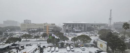 대설특보가 발효된 제주지역에 북서쪽 해상에서 유입되는 구름대 영향으로 시간당 0.5㎝ 안팎의 눈이 내리며 점점 눈발이 거세지고 있다. 사진은 제주도청에서 바라본 눈쌓인 제주교육청과 제주도의회 전경. 제주 강동삼 기자 |