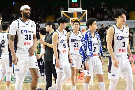 KCC 선수들이 원주DB프로미아레나에서 열린 2025~2026 LG전자 프로농구 DB전 패배 후 코트를 빠져나가고 있다. 사진 | KBL |