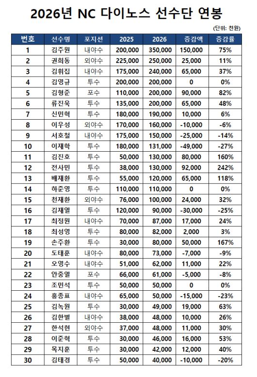 NC는 22일 2026시즌 연봉 재계약 대상자 70명 전원과 계약을 완료했다. 주전 유격수 김주원은 지난해 2억원에서 75% 인상된 3억 5000만원에 계약하며 재계약 대상자 중 최고 연봉을 기록했다. 김주원은 지난 시즌 팀 타선의 주축으로 자리매김하며 144경기 전 경기에 출전해 타율 2할8푼9리, 15홈런, 65타점, OPS 0.830을 기록했다.