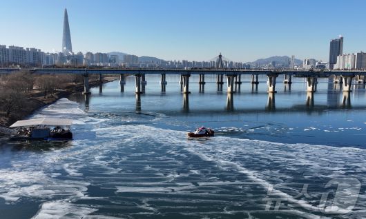 (서울=뉴스1) 김성진 기자 = 전국 대부분 지역 아침 기온이 영하 10도 안팎으로 떨어지며 한파가 이어진 22일 서울 한강 광나루한강공원 선착장 인근에서 119 광나루수난구조대가 순찰 근무를 하며 출동로 확보 작업을 하고 있다. 2026.1.22/뉴스1