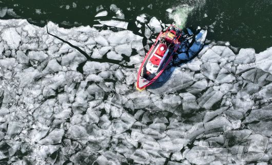(서울=뉴스1) 김성진 기자 = 전국 대부분 지역 아침 기온이 영하 10도 안팎으로 떨어지며 한파가 이어진 22일 서울 한강 광나루한강공원 선착장 인근에서 119 광나루수난구조대가 순찰 근무를 하며 출동로 확보 작업을 하고 있다. 2026.1.22/뉴스1