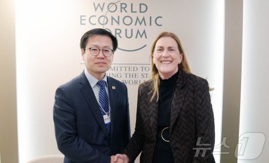(서울=뉴스1) = 여한구 산업통상부 통상교섭본부장이 21일(현지시간) 스위스 다보스에서 열린 ‘2026 세계경제포럼 연차회의’에서 헬렌 부들리거 아르티에다 스위스 연방 경제담당국무장관과 면담을 갖고 기념촬영을 하고 있다. (산업통상부 제공. 재판매 및 DB 금지) 2026.1.22/뉴스1