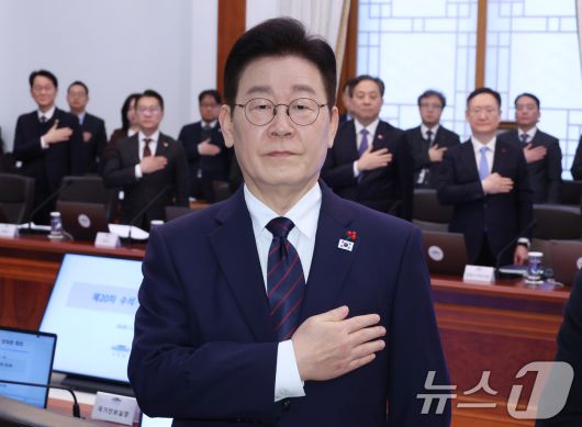 (서울=뉴스1) 허경 기자 = 이재명 대통령이 22일 청와대에서 열린 수석보좌관회의에서 참석자들과 국민의례를 하고 있다. (청와대통신사진기자단) 2026.1.22/뉴스1