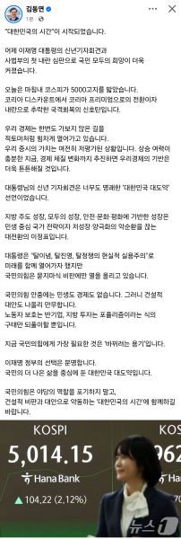 김동연 경기도지사가 22일 코스피 5000선 돌파와 관련해 "코리아 디스카운트에서 '코리아 프리미엄'으로 전환되는 신호탄이자 내란으로 추락한 국격회복의 신호탄"이라고 평가했다.
