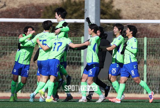 [스포티비뉴스=김천, 곽혜미 기자] 제22회 1,2학년 대학축구대회 중앙대와 상지대의 결승전이 22일 오후 경상북도 김천대학교 대운동장에서 열렸다. 선취골을 넣은 상지대 선수들이 기뻐하고 있다.