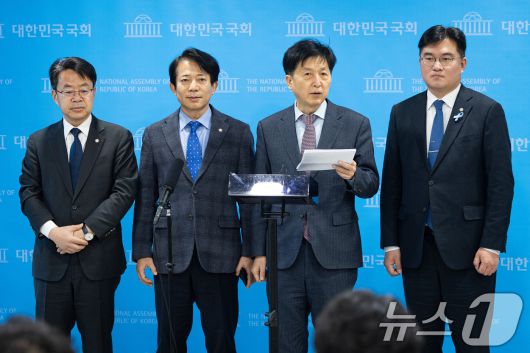 (서울=뉴스1) 유승관 기자 = 오기형 더불어민주당 코스피5000 특별위원장이 22일 서울 여의도 국회 소통관에서 코스피 5000 돌파 청와대 초청 오찬을 마친 후 브리핑을 하고 있다. 왼쪽부터 박홍배, 이강일 의원, 오 위원장, 정준호 의원. 2026.1.22/뉴스1