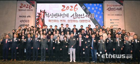 2026 혁신벤처업계 신년인사회가 22일 서울 서초구 엘타워에서 열렸다. 한성숙 중소벤처기업부 장관, 성미숙 한국여성벤처협회장, 송병준 벤처기업협회장, 강병준 전자신문 대표 등 참석자들이 기념촬영 하고 있다.