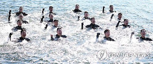 (창원=연합뉴스) 김동민 기자 = 해군 심해잠수사(SSU) 부대원들이 22일 경남 창원시 진해구 진해 군항에서 혹한기 훈련 중 군가를 열창하고 있다. 이날 진해구 기온은 영하 6도, 체감온도는 영하 11도였다. 2026.1.22