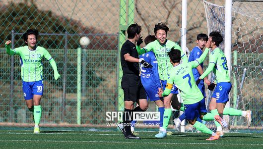 [스포티비뉴스=김천, 곽혜미 기자] 제22회 1,2학년 대학축구대회 중앙대와 상지대의 결승전이 22일 오후 경상북도 김천대학교 대운동장에서 열렸다. 선취골을 넣은 상지대 선수들이 기뻐하고 있다.