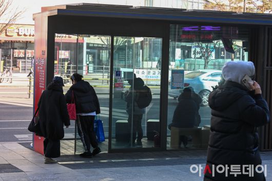 매서운 한파가 이어진 22일 서울 성동구 '성동형 스마트쉼터'를 찾은 시민들이 잠시 몸을 녹이고 있다. 겨울철 100만 명이 찾은 '성동형 스마트쉼터’는 총 56개소로 출근길과 등하굣길 등 주민들의 일상 동선과 밀접한 지역에 주로 설치돼 이용 편의성을 높이고 한파를 비롯한 폭염, 미세먼지 등 이상기후에도 든든한 휴식 공간이 되고 있다. 이와 함께 지능형 난방 시스템, 버스정보 안내 시스템, 공기정화 시스템, 사물인터넷(IoT) 관제시스템 등 첨단 기능을 갖춰 쾌적하고 안전한 환경을 제공한다. /정재훈 기자