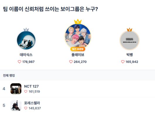 데이식스는 탄탄한 음악성과 라이브 실력을 바탕으로 오랜 기간 팬들의 신뢰를 쌓아왔다. 각 멤버의 개별 활동과 완성도 높은 곡들이 이어지며 투표에서도 안정적인 상위권을 유지했다.