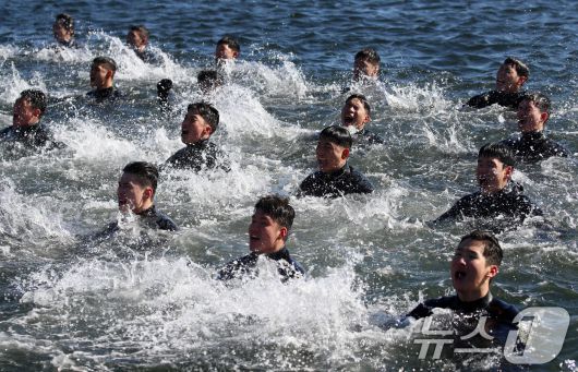(창원=뉴스1) 윤일지 기자 = 전국적으로 맹추위가 기승을 부린 22일 경남 창원 진해 군항에서 해군 심해잠수사(SSU)들이 차가운 겨울 바다로 뛰어들어 군가를 부르며 혹한기 훈련을 하고 있다. 2026.1.22/뉴스1yoonphoto@news1.krCopyright ⓒ 뉴스1. All rights reserved. 무단 전재 및 재배포, AI학습 이용 금지.