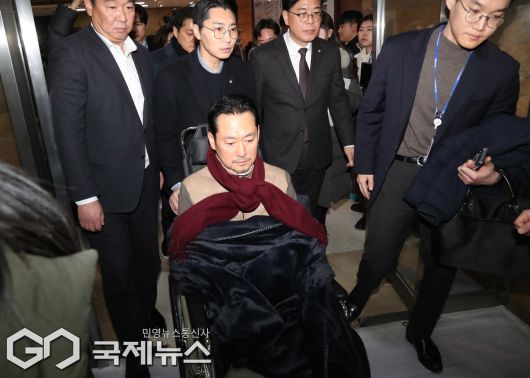 (서울=국제뉴스) 장동혁 국민의힘 대표가 22일 서울 여의도 국회에서 통일교·공천헌금 '쌍특검' 수용 촉구 단식을 마치고 병원 이송을 위해 국회를 나서고 있다./사진=이용우 기자