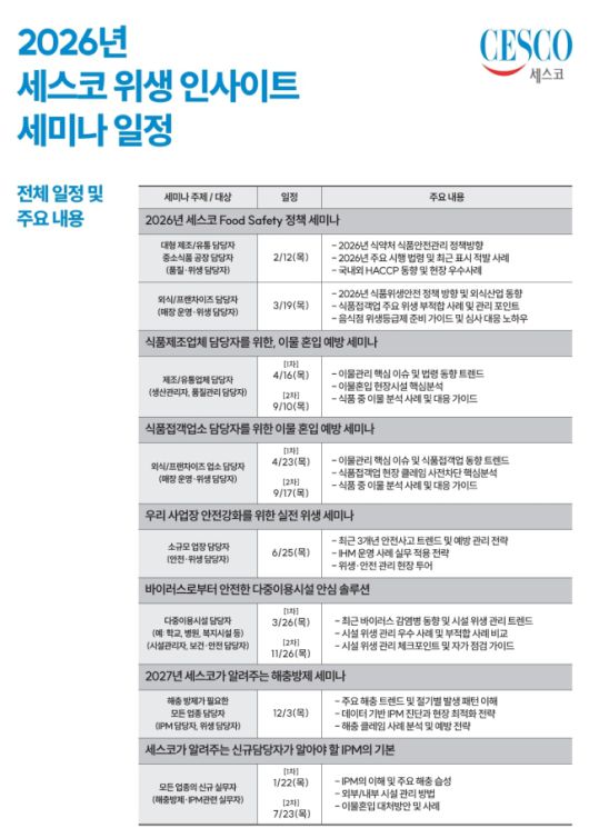 이후 세스코는 △식품안전 정책 변화와 현장 대응 전략을 다루는 Food Safety(식품안전) 정책 세미나(2월) △식품 제조·가공 현장의 이물 혼입 예방과 관리 기준을 제시하는 이물 혼입 예방 세미나(4월·9월) △사업장 안전과 위생관리 체계를 점검하는 산업 위생 세미나(6월) △다중이용시설을 중심으로 한 바이러스 감염 대응 세미나(3월·11월) △연말에는 한해 해충 발생 양상과 2027년 대응 전략을 정리하는 해충방제 세미나(12월) 등 환경위생 주요 이슈를 주제로 세미나를 이어갈 계획이다.