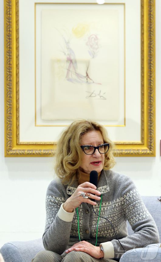 (서울=뉴스1) 김진환 기자 = 22일 오후 서울 강남구 코엑스에서 열린 '월드아트페스타 2026 : 살바도르 달리 아르질레 컬렉션'을 찾은 크리스틴 아르질레가 한 메체와 인터뷰를 하고 있다. 크리스틴 아르질레는 프랑스 컬렉터이자 살바도르 달리의 친구였던 피에르 아르질레의 딸로 이번 컬렉션을 기획했다. 2026.1.22 2026.1.22/뉴스1