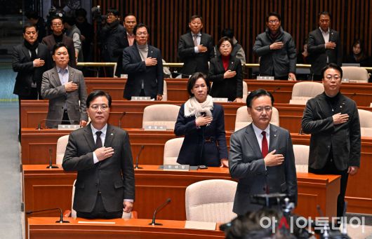 아시아투데이 송의주 기자 = 송언석 국민의힘 원내대표(맨 앞줄 왼쪽)를 비롯한 의원들이 22일 국회에서 열린 긴급 의원총회에서 국기에 대한 경례를 하고 있다. ⓒ "젊은 파워, 모바일 넘버원 아시아투데이"
