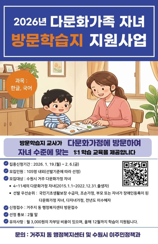 수원특례시는 다문화가족 자녀에게 한글·국어 방문학습을 지원하는 '2026 다문화가족 자녀 방문학습지 지원 사업' 참여자를 2월 6일까지 모집한다.