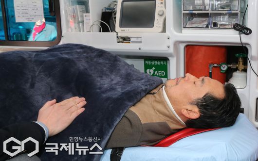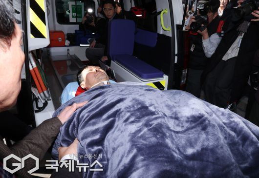 (서울=국제뉴스) '통일교·공천헌금' 쌍특검법 수용을 촉구하며 단식을 시작한 장동혁 국민의힘 대표가 22일 서울 여의도 국회에서 단식 8일 만에 박근혜 전 대통령의 단식 중단 권고를 받아들이며 단식을 중단하고 병원으로 이송되고 있다./사진=이용우 기자