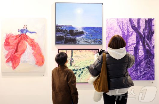 (서울=뉴스1) 김진환 기자 = 22일 오후 서울 강남구 코엑스에서 열린 '월드아트페스타 2026'을 찾은 관람객들이 전시 작품을 둘러보고 있다. “예술은, 축제다”를 기치로 열리는 이번 전시회는 오는 25일까지 열린다. 2026.1.22 2026.1.22/뉴스1
