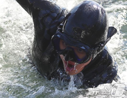 (창원=뉴스1) 윤일지 기자 = 전국적으로 맹추위가 기승을 부린 22일 경남 창원 진해 군항에서 열린 혹한기 내한훈련에서 해군 심해잠수사(SSU)가 오리발 수영을 하고 있다. 2026.1.22/뉴스1yoonphoto@news1.krCopyright ⓒ 뉴스1. All rights reserved. 무단 전재 및 재배포, AI학습 이용 금지.