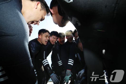 (창원=뉴스1) 윤일지 기자 = 전국적으로 맹추위가 기승을 부린 22일 경남 창원 진해 군항에서 열린 혹한기 내한훈련에서 해군 심해잠수사(SSU)들이 오리발 수영을 마친 뒤 포효하고 있다. 2026.1.22/뉴스1