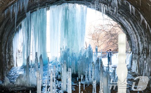 (연천=뉴스1) = 연일 영하권의 매서운 한파가 이어진 22일 경기 연천군 신서면 경원선 폐터널을 방문한 관광객이 역고드름을 촬영하고 있다. 2026.1.22/뉴스1