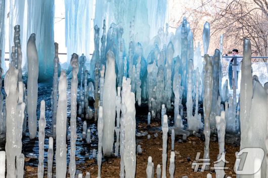 (연천=뉴스1) = 연일 영하권의 매서운 한파가 이어진 22일 경기 연천군 신서면 경원선 폐터널을 방문한 관광객이 역고드름을 촬영하고 있다. 2026.1.22/뉴스1