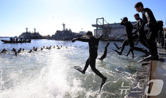 (창원=뉴스1) 윤일지 기자 = 전국적으로 맹추위가 기승을 부린 22일 경남 창원 진해 군항에서 해군 심해잠수사(SSU)들이 차가운 겨울 바다로 뛰어들며 혹한기 훈련을 하고 있다. 2026.1.22/뉴스1