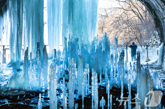 (연천=뉴스1) = 연일 영하권의 매서운 한파가 이어진 22일 경기 연천군 신서면 경원선 폐터널을 방문한 관광객이 역고드름을 촬영하고 있다. 2026.1.22/뉴스1