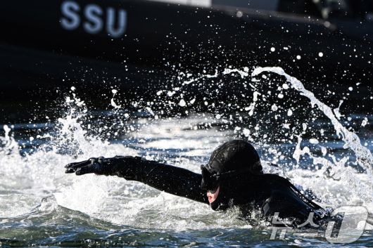 (창원=뉴스1) 윤일지 기자 = 해군 특수전전단 해난구조전대(SSU) 심해잠수사들이 22일 경남 창원 진해군항에서 열린 혹한기 내한 훈련 중 오리발 수영을 하고 있다. (공동취재) 2026.1.22/뉴스1