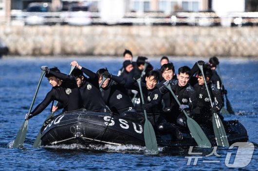 (창원=뉴스1) 윤일지 기자 = 해군 특수전전단 해난구조전대(SSU) 심해잠수사들이 22일 경남 창원 진해군항에서 열린 혹한기 내한 훈련 중 고무보트 패들링을 하고 있다. (공동취재) 2026.1.22/뉴스1yoonphoto@news1.krCopyright ⓒ 뉴스1. All rights reserved. 무단 전재 및 재배포, AI학습 이용 금지.