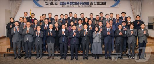 (서울=뉴스1) = 안규백 국방부장관이 22일 오전 국방컨벤션에서 개최된 민관군 합동 특별자문위원회 종합보고회에서 참석자들과 기념촬영을 하고 있다. (국방부 제공. 재판매 및 DB 금지) 2026.1.22/뉴스1urodoct2@news1.krCopyright ⓒ 뉴스1. All rights reserved. 무단 전재 및 재배포, AI학습 이용 금지.