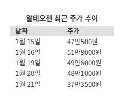 16일 급등 이후 조정은 빠르게 시작됐다. 지난 19일엔 종가 49만6000원으로 4.2% 하락했고, 20일엔 48만1000원(-3.0%)으로 하락 흐름이 이어졌다. 이날 알테오젠은 영국 제약사 GSK의 자회사 테사로와 체결한 ALT-B4 기술이전 계약 규모가 약 4200억원이라고 공시했고, 시장엔 기대치에 못 미친다는 평가가 확산했다.