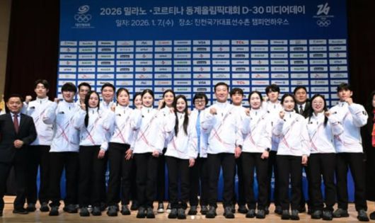 지난 7일 충북 진천선수촌에서 열린 2026 밀라노·코르티나 동계올림픽대회 D-30 미디어데이에서 대표팀 선수들이 파이팅을 외치며 기념촬영하고 있다. [사진 = 김택수 대한체육회 진천국가대표선수촌장 SNS] |