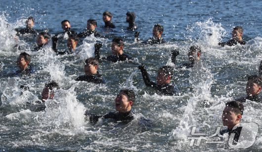 (창원=뉴스1) 윤일지 기자 = 전국적으로 맹추위가 기승을 부린 22일 경남 창원 진해 군항에서 해군 심해잠수사(SSU)들이 차가운 겨울 바다로 뛰어들어 군가를 부르며 혹한기 훈련을 하고 있다. 2026.1.22/뉴스1yoonphoto@news1.krCopyright ⓒ 뉴스1. All rights reserved. 무단 전재 및 재배포, AI학습 이용 금지.