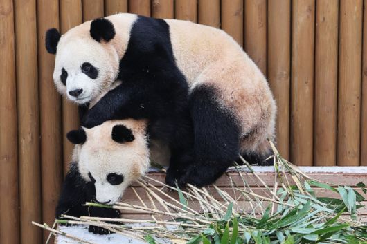 경기도 용인시 에버랜드에서 쌍둥이 판다 루이바오와 후이바오가 눈 쌓인 평상 위에서 장난치고 있다. 연합뉴스 |